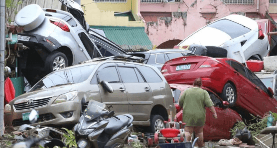Vehicles lie piled on after flooding caused by Typhoon Kalmaegi in Cebu city, central Philippines, Tuesday, Nov. 4, 2025. (AP Photo/Jacqueline Hernandez)