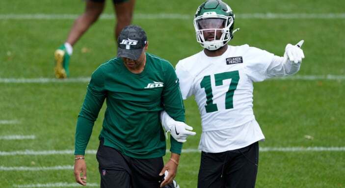 New York Jets' Kris Boyd (17) participates during an NFL football practice in Florham Park, N.J., Thursday, May 29, 2025. AP Photo/Seth Wenig