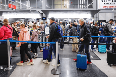 Travelers wait in line at a security checkpoint at O'Hare International Airport in Chicago, Nov. 25, 2025, ahead of the upcoming Thanksgiving holiday. Kamil Krzaczynski/AFP via Getty Images